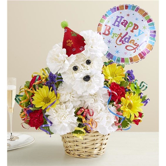 Every birthday party needs a party animal…especially one as cute as ours! Our truly original kitty is handcrafted from crisp white carnations and surrounded by a colorful mix of blooms. Arriving in a charming basket and ready to celebrate, this whimsical whiskered pal is the “purr-fect” pick for a fun-filled day. One-sided 3D arrangement with white carnations, red mini carnations, yellow daisy poms, Athos poms, purple statice; accented with assorted greenery Crafted in the shape of a cat, complete with ears, eyes, nose with whiskers Features a festive felt birthday hat and colorful curled ribbon accents Artistically designed in our lined wicker pet basket; measures 3.5"H x 5"D Arrangement measures approximately 11"H x 11"W Our florists hand-design each arrangement, so colors, varieties and container may vary due to local availability Add to their gift: 8"D Mylar “Happy Birthday” balloon; design may vary due to local availability